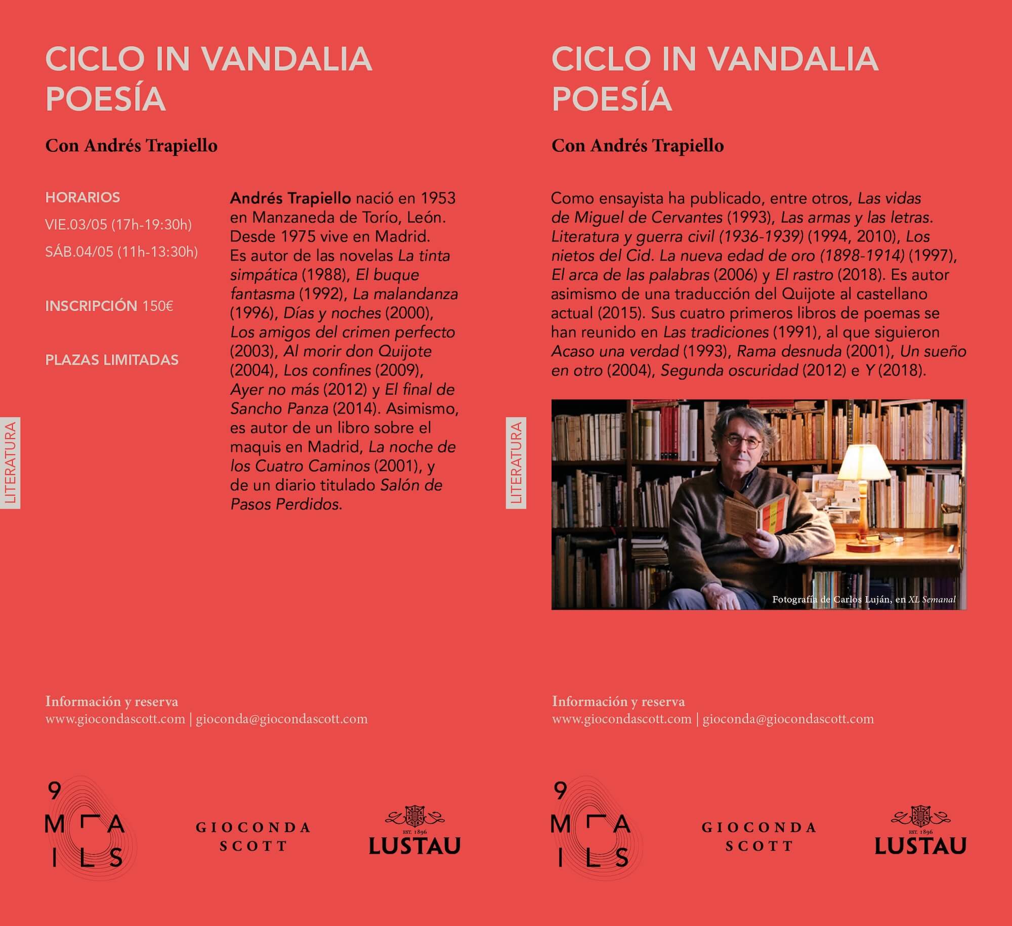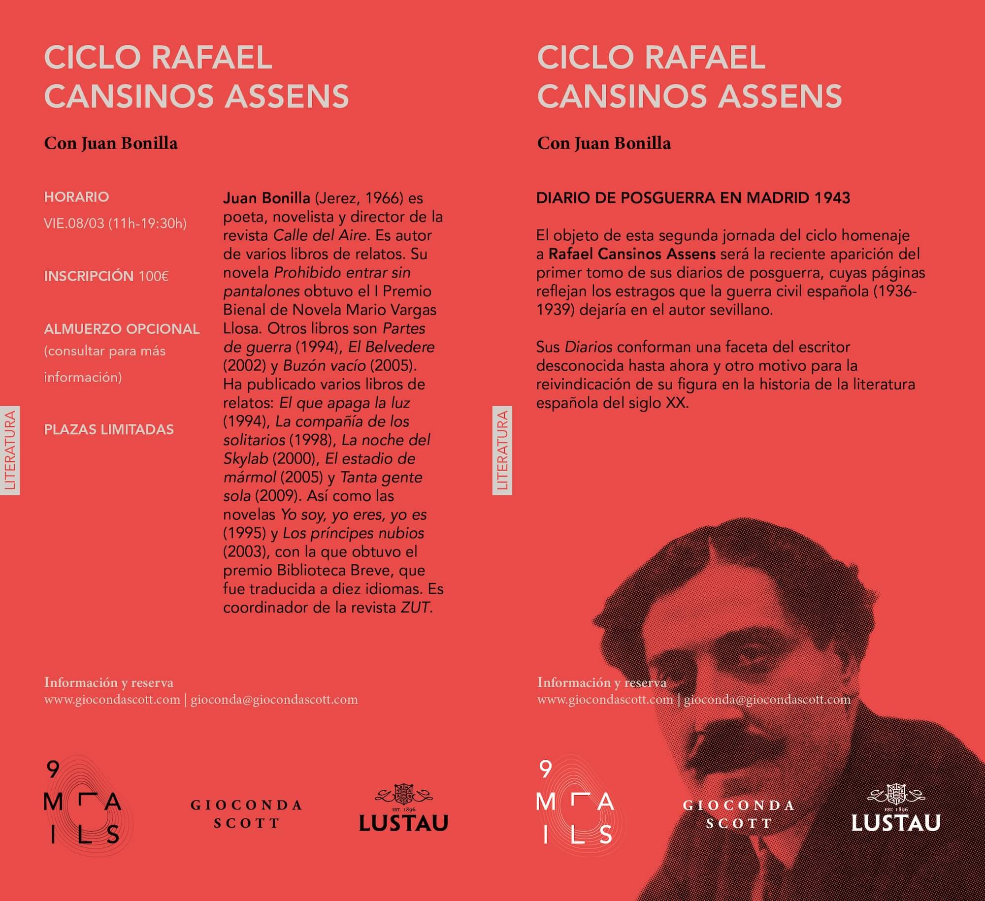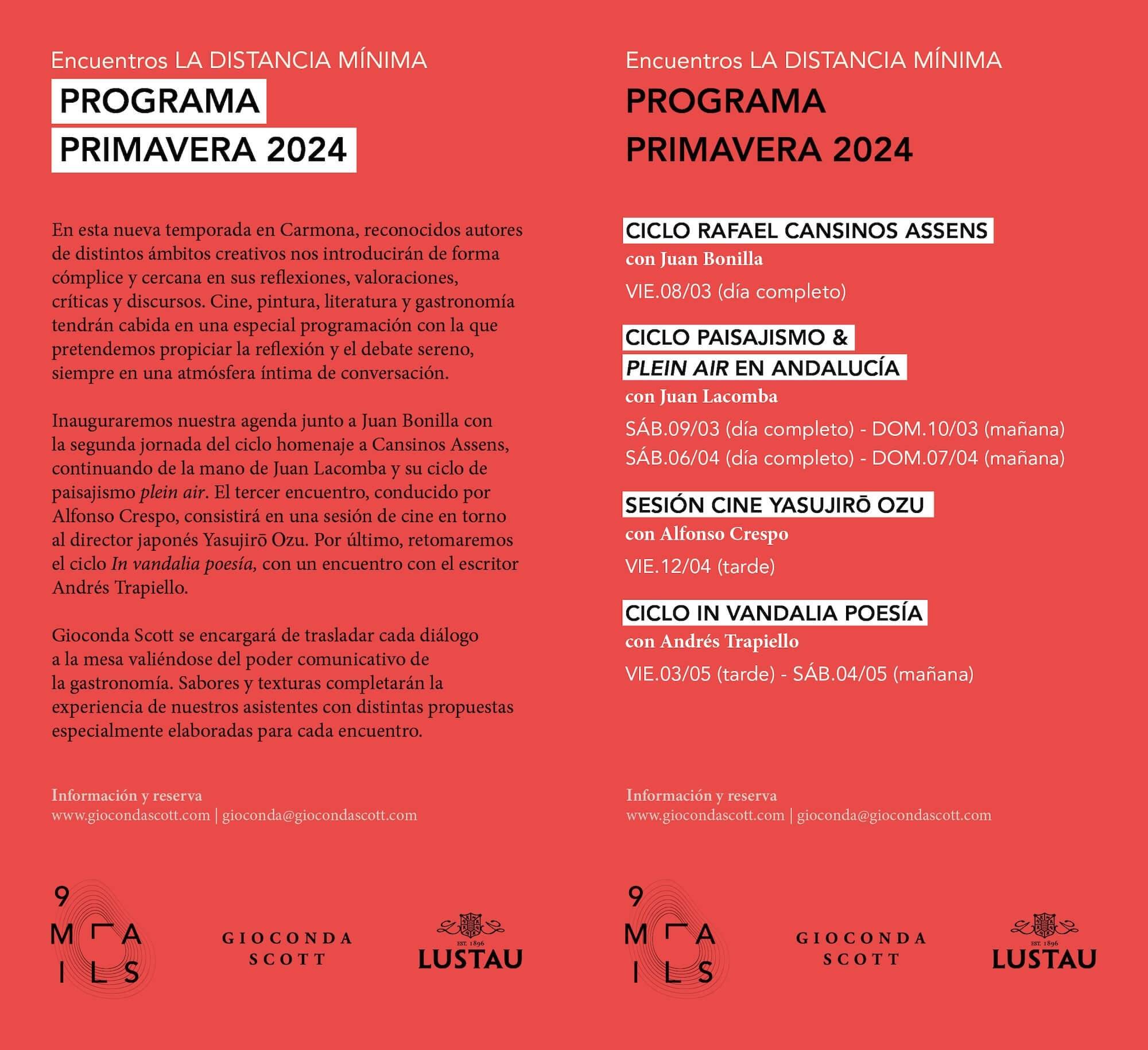 La agenda comienza con Juan Bonilla, como parte de la serie de homenajes a Cansinos Assens, seguida por la serie de paisajes al aire libre de Juan Lacomba, y una sesión de cine dirigida por Alfonso Crespo sobre el director japonés Yasujirō Ozu. La temporada se cierra con la serie *In Vandalia Poetry*, con la participación del escritor Andrés Trapiello. Gioconda Scott enriquecerá cada evento traduciendo cada diálogo a la mesa, creando sabores y texturas especialmente seleccionados para complementar cada encuentro.